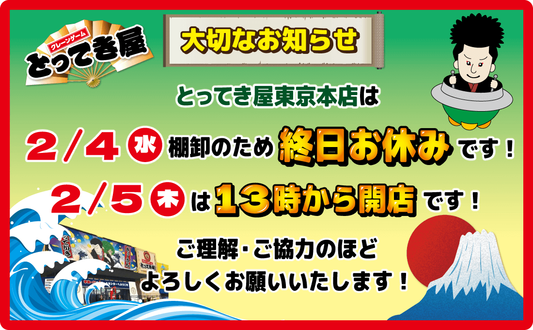 2月4日(水) 店休日・5日(木)営業時間変更のお知らせ