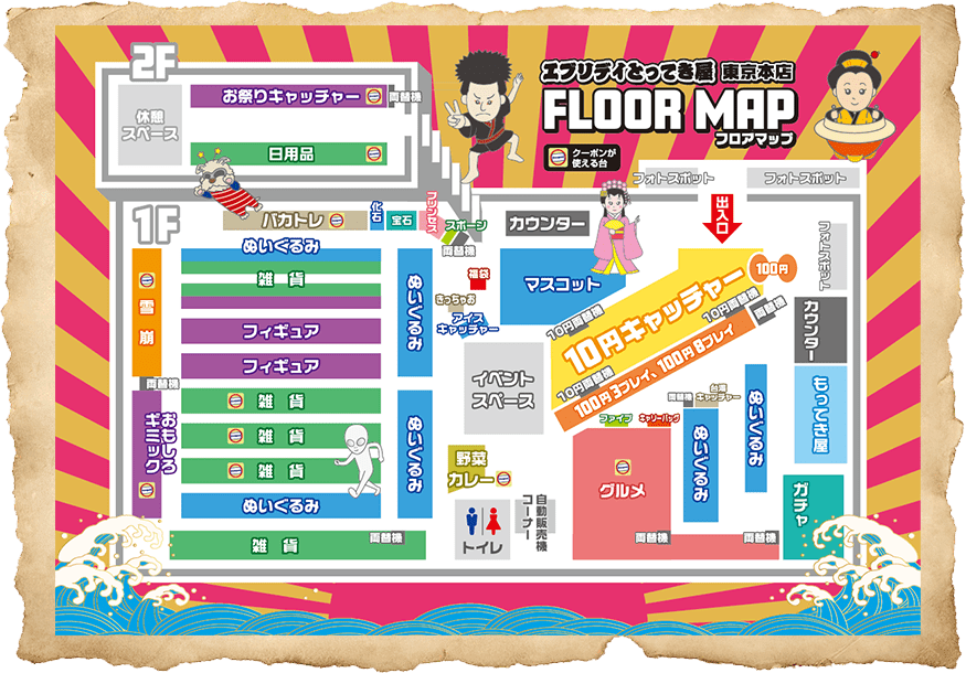 とってき屋のキャラクター達が施設の装飾、看板や映像に登場。その他、意外な所にも!?施設内に点在するキャラクターを探してね!